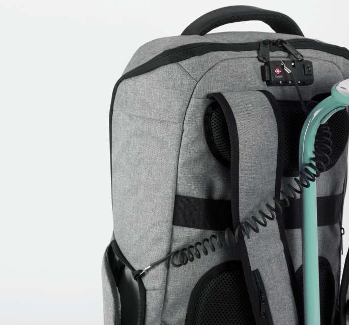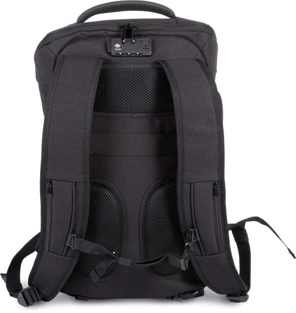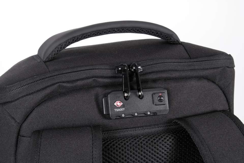 100% poliészter Amelyből 50% újrahasznosított poliészter Lopásgátló hátizsák 600D poliészterből Megerősített vágásálló elülső panel Hátul cipzáras TSA kombinációs zárral Hátvédett, gyorsan hozzáférhető, cipzáras zseb Állítható vállpántok és mellkaspánt 2 cipzáras zseb a vállpántokon Az alján 2 pánt a kabát vagy pulóver rögzítéséhez 2 oldalzseb 1 oldalzseb beépített USB porttal, amely hozzá van kötve a belső Power Bank tartójához (belső mikro USB kábel is jár hozzá) 1 oldalzseb lopásgátló spirál kábellel, hogy a hátizsákot az asztal/szék lábához lehessen rögzíteni Belső rekesz párnázott tokkal legfeljebb 15" laptopok számára Párnázott tok legfeljebb 11" tabletek számára 2 hálós cipzáras zseb 2 kivehető cipzáras tasak a kábeleknek vagy kiegészítőknek 2 belső zseb, az egyik a palackok vagy üvegek részére, a másik a Power Banknek Integrált esővédő